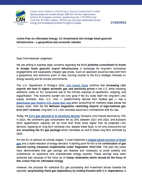 Together with more than 50 civil society organisations, we sent an urgent letter to Commissioner Jørgensen, raising deep concerns about the EU’s potential plans to invest in foreign LNG and fossil gas export infrastructure in exchange for long-term contracts and lower gas prices, as revealed by the first draft of the Affordable Energy Action Plan.